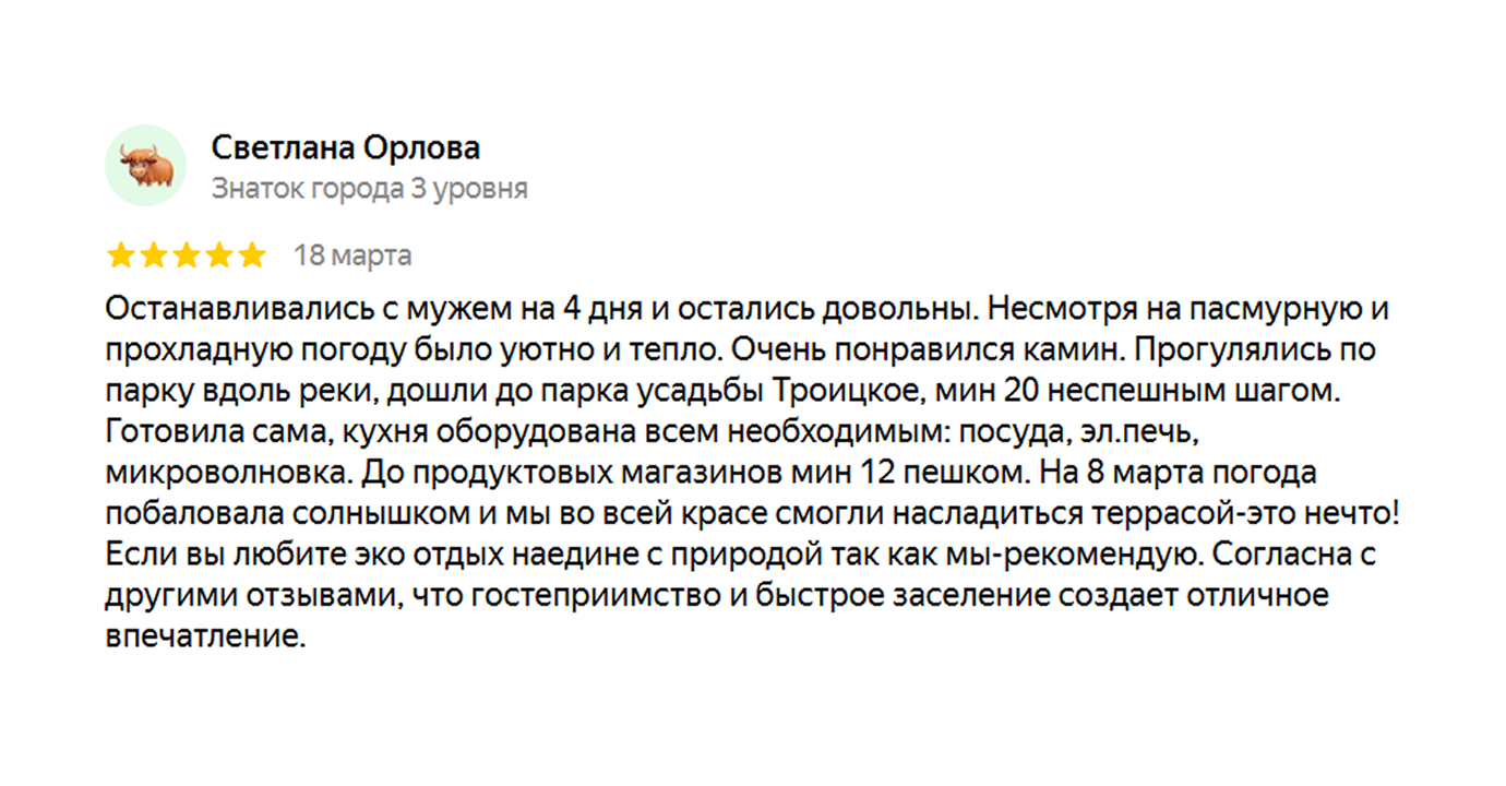 Час от Москвы без ощущения дальней поездки. Никаких утомительных дорог. Утром вы ещё на работе, вечером уже в мягкой постели с вином и фильмом